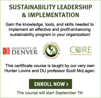 Gain the knowledge, tools, and skills needed to implement an effective and profit-enhancing sustainability program in your organization! Our Sustainability Leadership and Implementation Certificate course at DU has already helped empower sustainability professionals at Chipotle, DaVita, White Wave, Lockheed, Eco Products, Denver Public Schools, and Children’s Hospital Colorado. Learn more and sign up here.